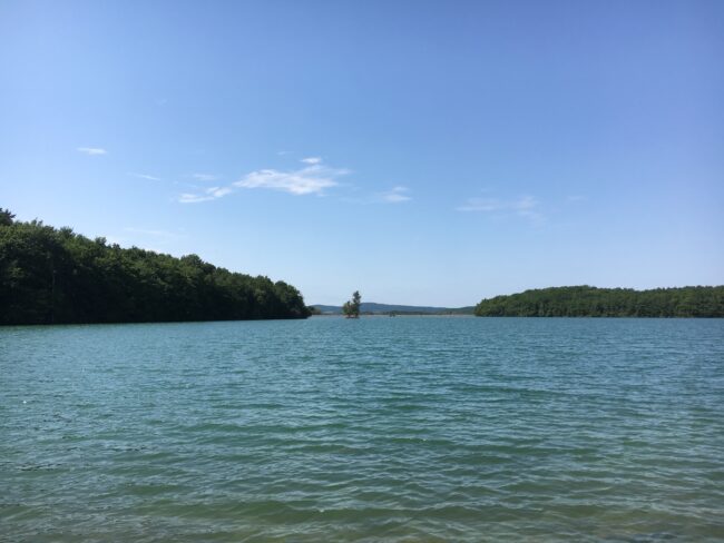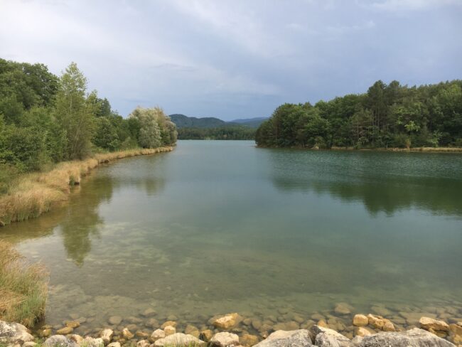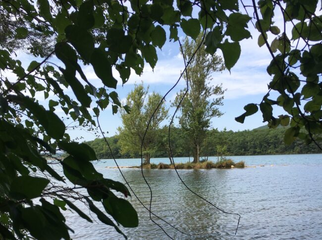 Lake Montbel is a reservoir created in 1985 and located in the Pyrenees, between the departments of the Ariège and Aude. Fed by the waters of the Hers-Vif, each summer a large percentage of the lake irrigates hectares of agricultural land, while a small proportion, left at a constant level, and undisturbed for 35 years, has become so biologically rich that its ecological status is listed as a ‘Zone Spéciale de Conservation under the EU project 2000 Zone Natural.’ Despite this, the lake’s managers have selected Coucoo, a private company which develops luxury resorts in natural settings, to build a hotel complex around the edges of the constant lake, to offer their clients experiences of ‘disconnection’ – ‘out of time.’ Towards the southern edge of the lake sits a tiny island, apparently untouched – also ‘out of time.’ This writer enters the scene as someone who has spent the past 18 years swimming back and forth across the island on summer evenings, to and from the island. Roaming around the edges of the lake and swimming across it, this site-writing pauses at several points to consider what this untouched island, once a hilltop, its edges now located in an constant yet artificial lake under threat, offers utopic practice.